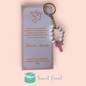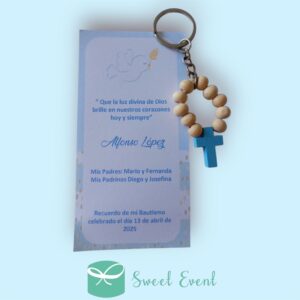 30 llaveros rosario madera + estampitas
